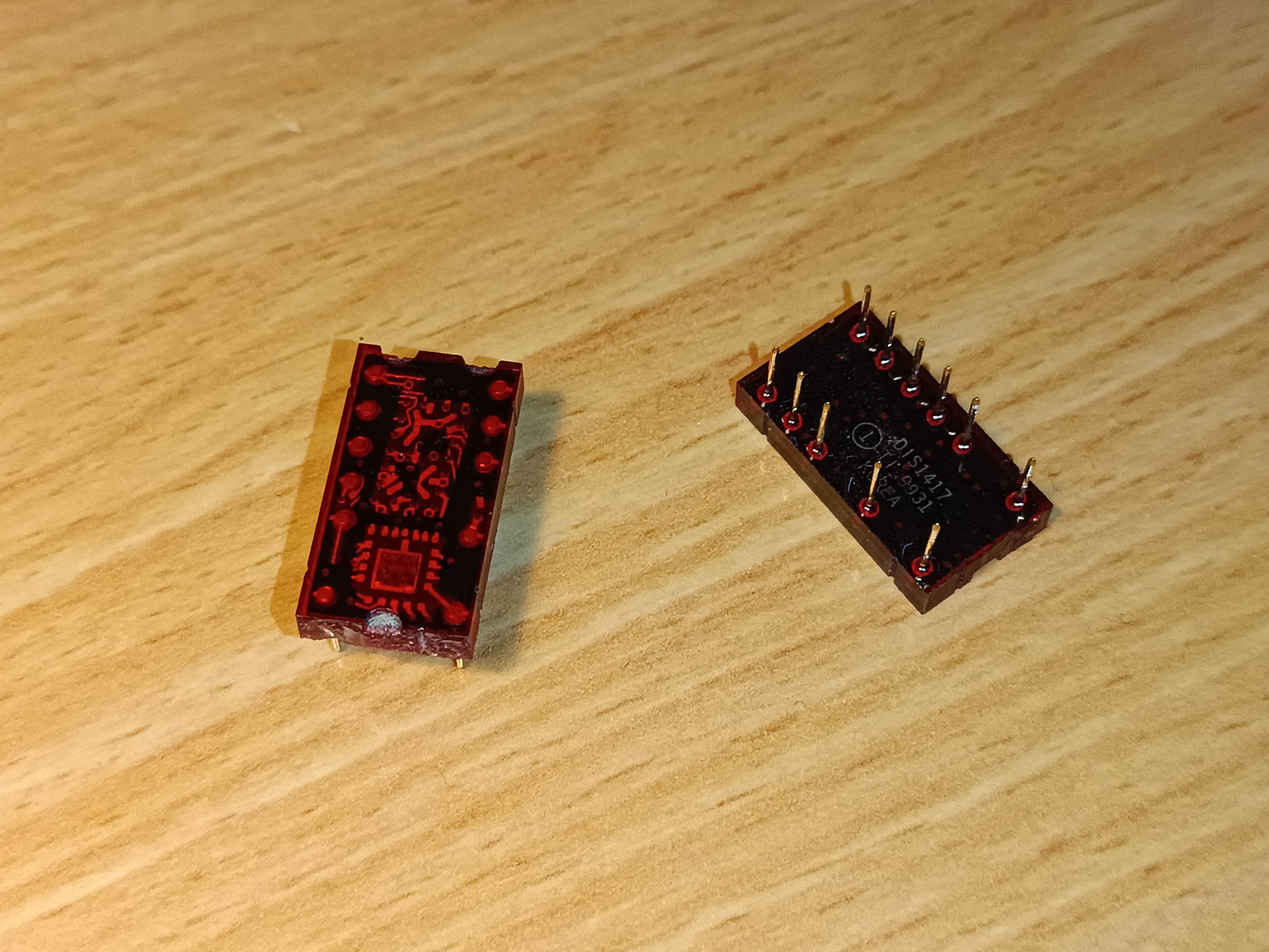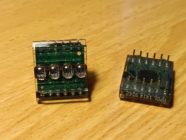 These chips are Raytheon-manufactured equivalents to the MC962, which I believe to be manufactured in week 29 of 1969. No datasheet for this exists on the web, but I have found a Motorola DTL logic product catalog that contains some datasheet-adjacent information for the MC962, including pin functions. These red-pink (rink?) chips are working, contain three triple-input NAND gates, and have the same pinout as the 74x10 logic chip. The pins are gold-plated and have a "1" shaped hole in pin 1. Due to the unscrupulous ethics of the manufacturer, I refer to these as sinister semiconductors.