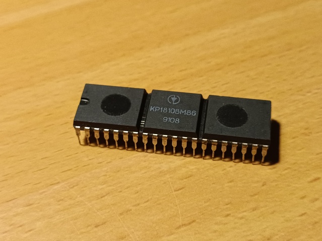 Soviet clone of the Intel 8086 CPU. Pin and binary compatible with the i8086. Has a 2.50mm pin pitch, instead of the much more common 2.54mm pin pitch of the west, making it a poor fit in breadboards and chip sockets.