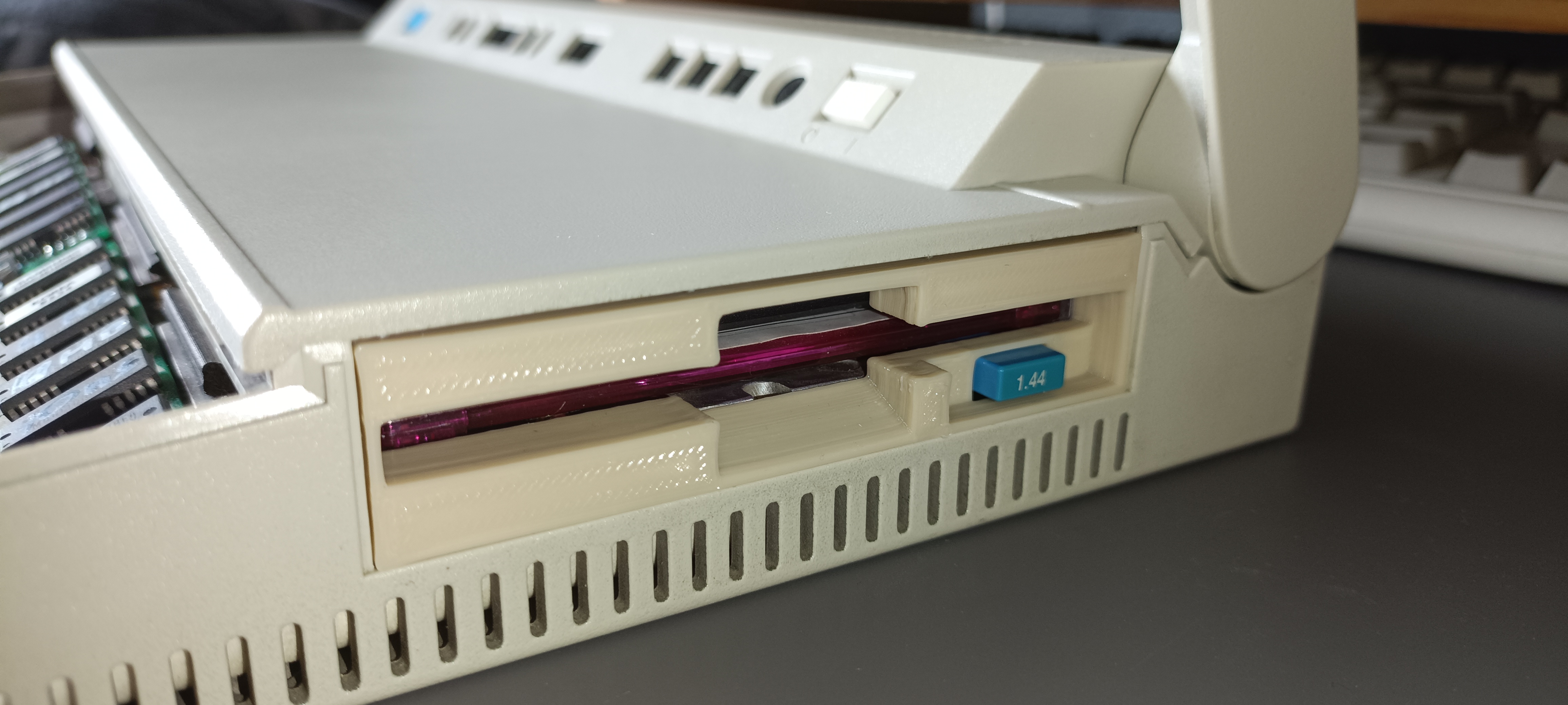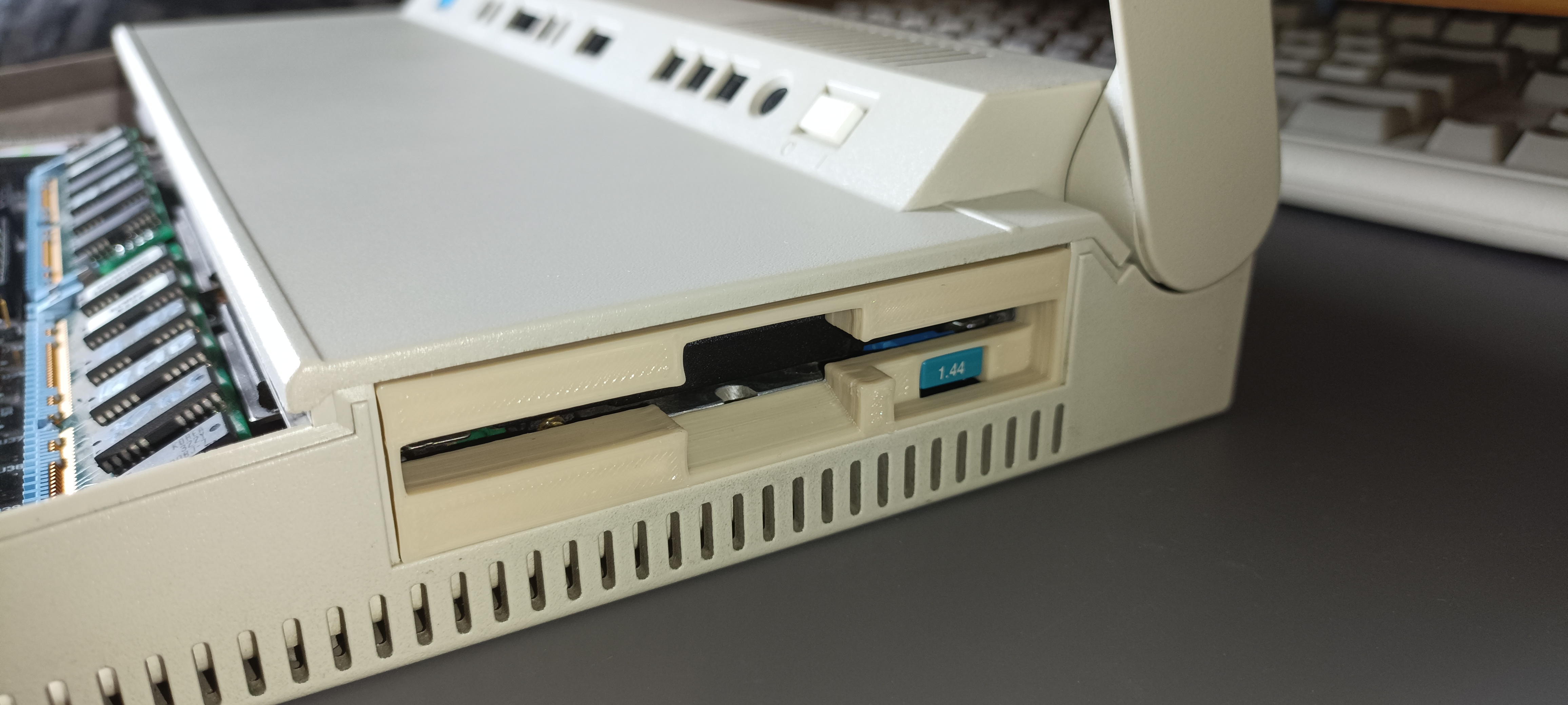 I designed and 3D printed a floppy disk drive faceplate using photos from the internet as visual references. Having no faceplate makes