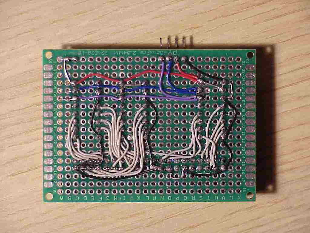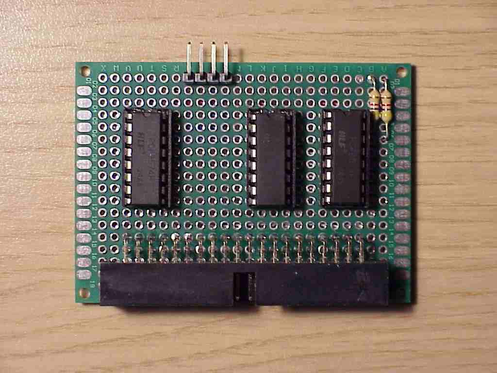 During October 2024, I built the interface on a piece of protoboard, following the schematics on Durandal's webpage. I got lazy and skipped the decoupling capacitors for each IC.