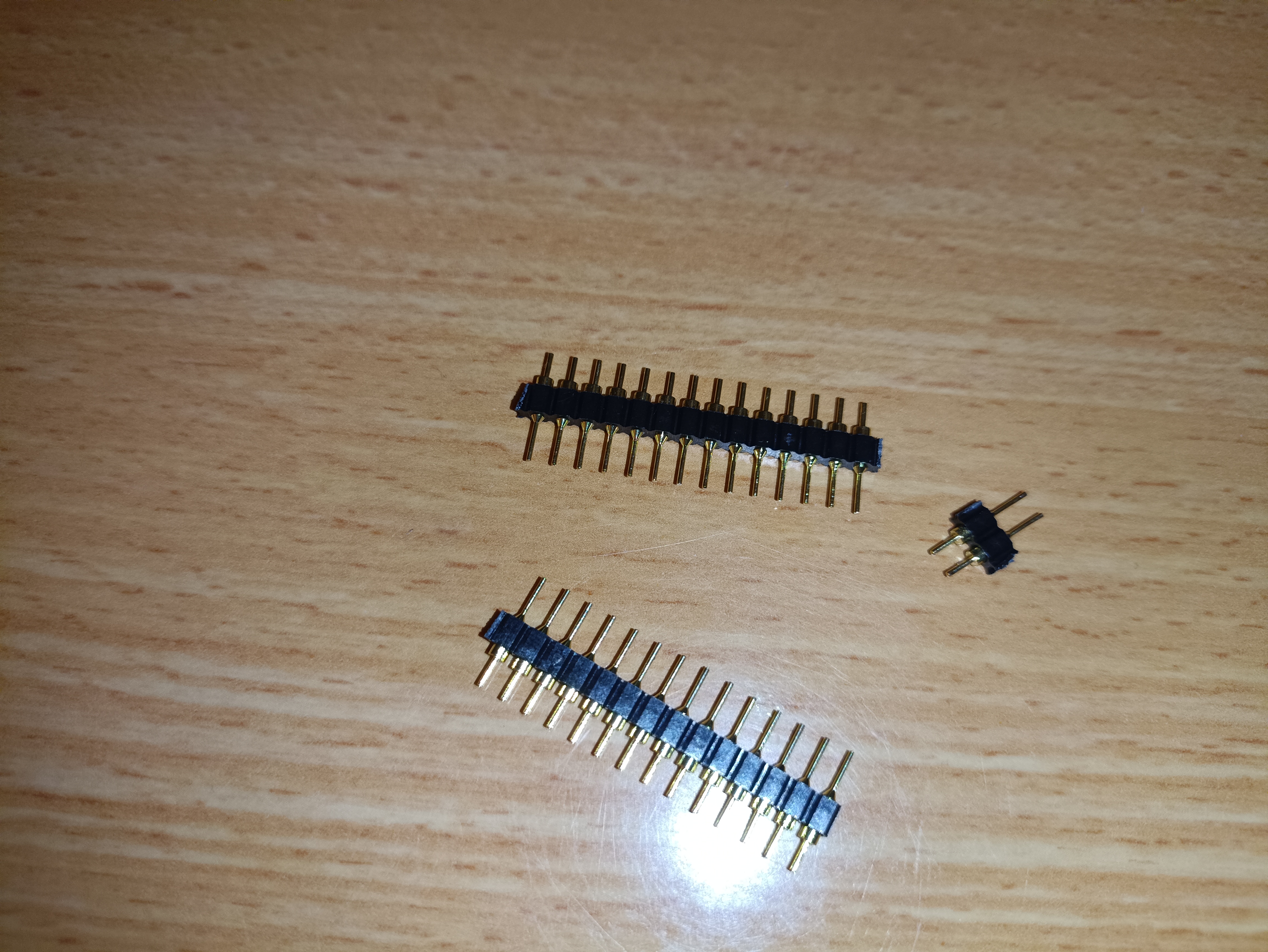 - Break apart some single-row round pin headers. One length of 2 pins and two lengths of 14 pins are needed.
